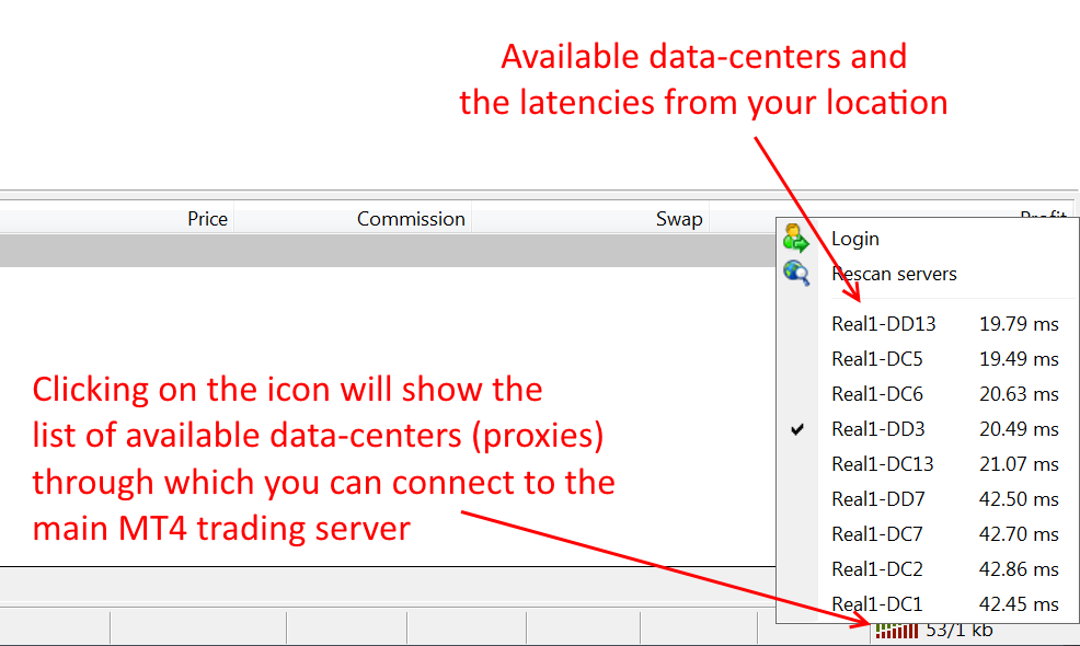 It has been known that sometimes traders experience connection issues when connecting to an MT4 server, especially if they are located far away from the main server or are using an ISP that heavily restricts network traffic (such as in China). In case issues prevail traders can change the data center they are connected to in MT4 by left clicking on the Connection Status indicator. Upon clicking, a list of available data centers will appear along with the latency to each one. This allows the trader to make sure they are connected to the best datacentre for their location and if not, switch.