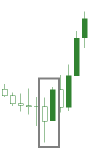 This is a reversal bullish signal. You should ignore this if it does not occur after a downtrend. The bullish candlestick opens below the low of the previous bearish candlestick. However, prices move higher and the candlestick closes above the midpoint of the previous bearish candlestick body.